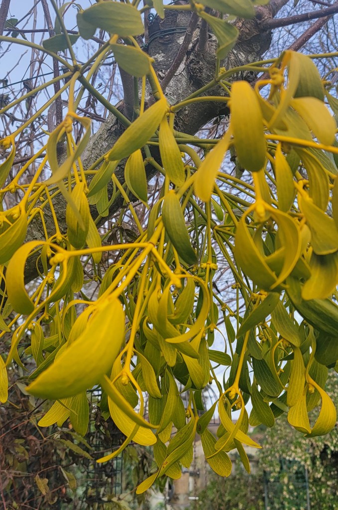 All the photos in the presentation were of green Mistletoe with a touch of yellow. In fact, I realised that pretty much my whole life, I have always thought that Mistletoe was green. Certainly, the sprig my father hung up in the hall to snatch a ‘kiss under the Mistletoe’ was green, and the huge balls of Mistletoe in the trees down the lanes of Gloucestershire where I live, are always green.