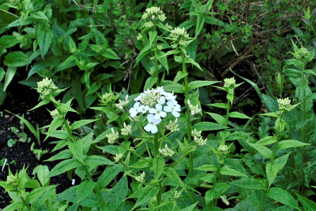 Finally, the first flowers of self seeded Hesperis matronalis ‘Alba’ which was originally grown many years ago from seed and now pops up wherever it feels like it. The violet version seems to have disappeared and just the white ones remain. The clove sweet fragrance on a warm summer evening is everything you could want from a scented plant. Mainly pollinated by moths I believe but enjoyed by many other pollinators too.