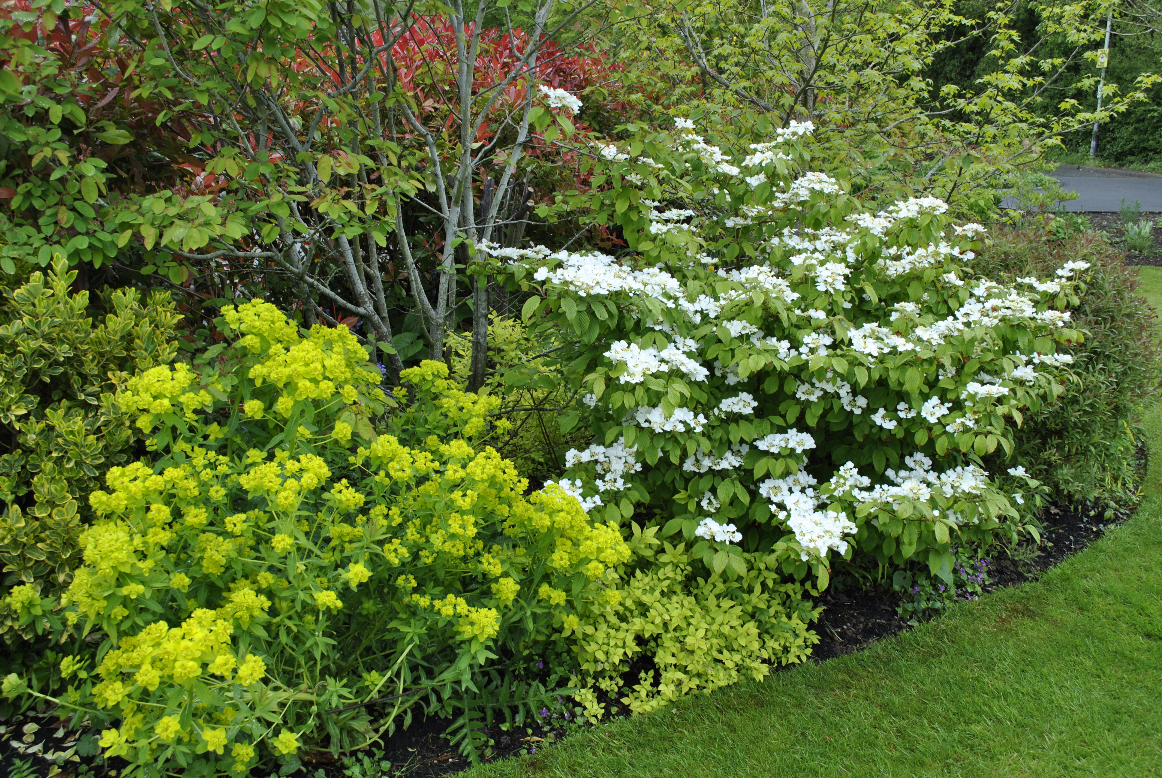 The garden is suddenly exploding into life thanks to the warm and wet conditions we are currently enjoying. This shrubbery with Viburnum plicatum and Euphorbia palustris make a fine show.