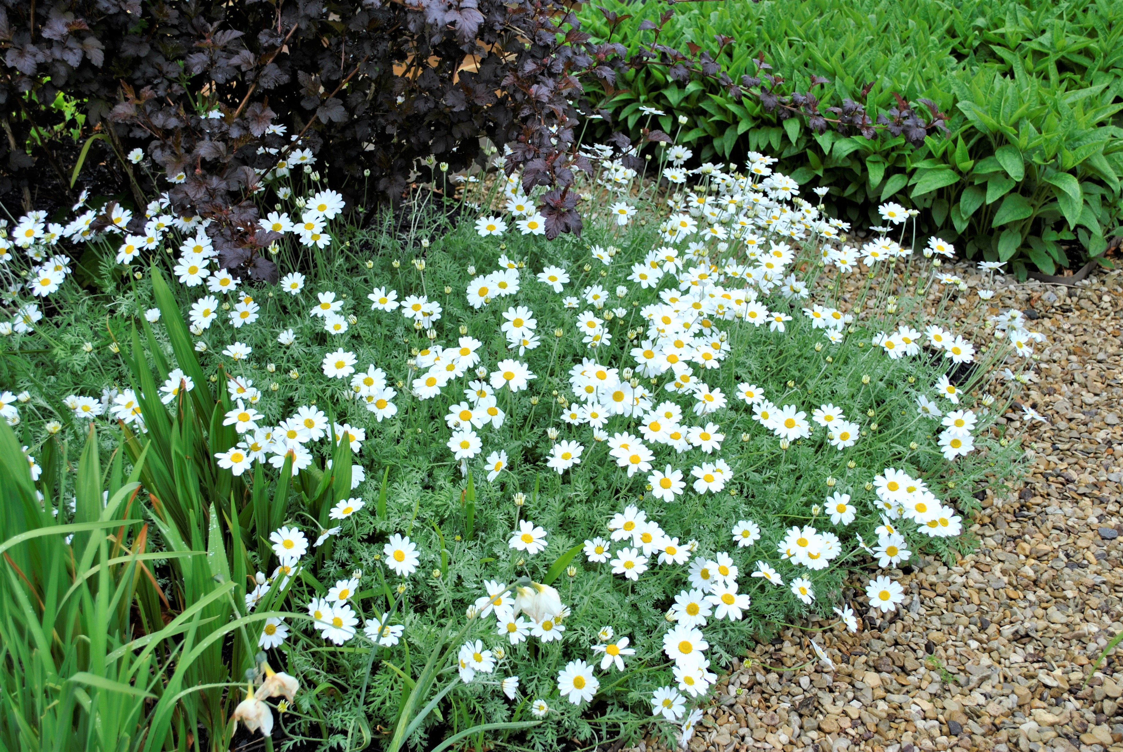 This Anthemis punctata softens the path edges and looks lovely backed up by the dark leaved Physocarpus ‘Diablo’. For a Mediterranean grey leaved plant, it certainly loves the rain!