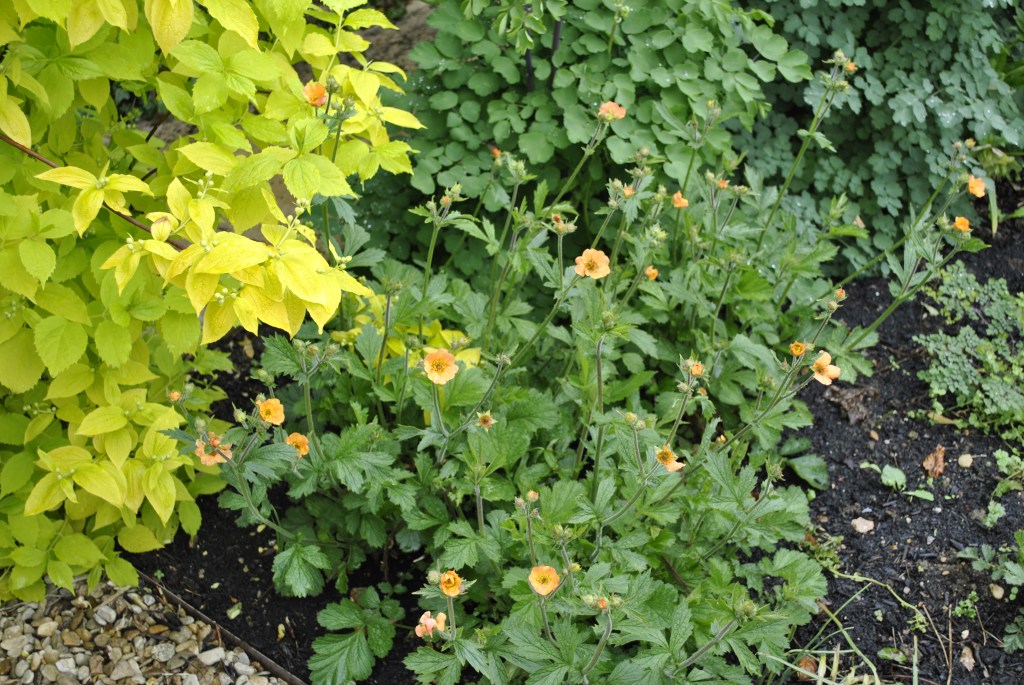 Geum ‘Totally Tangerine’ which seems to like its partly shaded position between the Philadelphus and the Thalictrums.