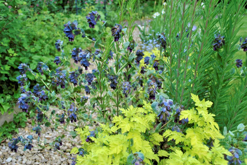 Everything is going bonkers! Weeds are outgrowing the plants, all the early flowerers have suddenly realised it’s mid-May and they had better get a shift on. The dry April has been replaced by ‘mixed’ weather conditions. Rain then sun then cloud then rain again, it just can’t make its mind up! This Cerinthe and the feverfew are fighting for position in the cottage garden border.