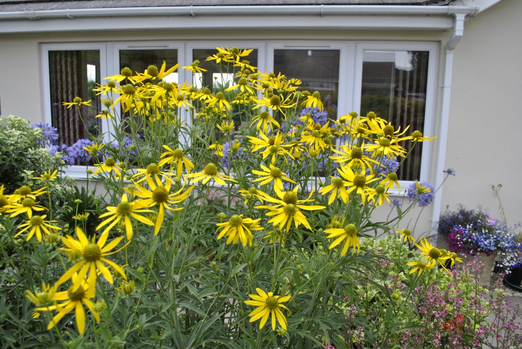 Rudbeckia laciniata, the tall species which needs a little support in windy locations but loved by bees and butterflies. I find it wilts in the heat of the day but recovers in the evening so I tend to water it in the morning rather than the evening, if I remember! It provides stature and presence in a mixed border, and even if you are a bit sniffy about yellow daisies, it has its place alongside blue things like my Agapanthus in the background. I have seen it with Eryngiums and tall blue Campanula lactiflora which is a great combination.