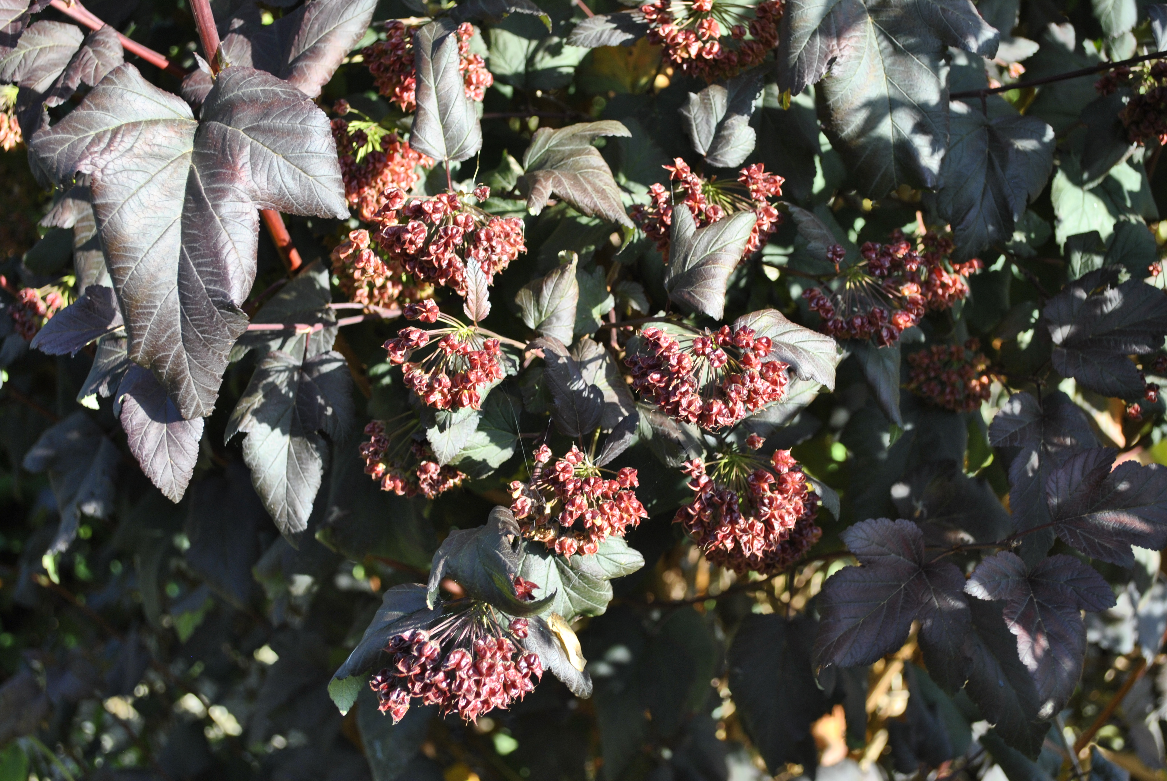 The fat red berries on the dark leaved Physocarpus ‘Diablo’ give this shrub an extra appeal at this time of year. Those who hard prune it miss out on this treat as they flower and fruit on the previous year’s wood, a bit like a Philadelphus or Cotinus. I now do a three stage prune to get new stems from the base, new stems from semi-pruned older branches and the height, flowers and fruit on untouched central branches. It seems to work!