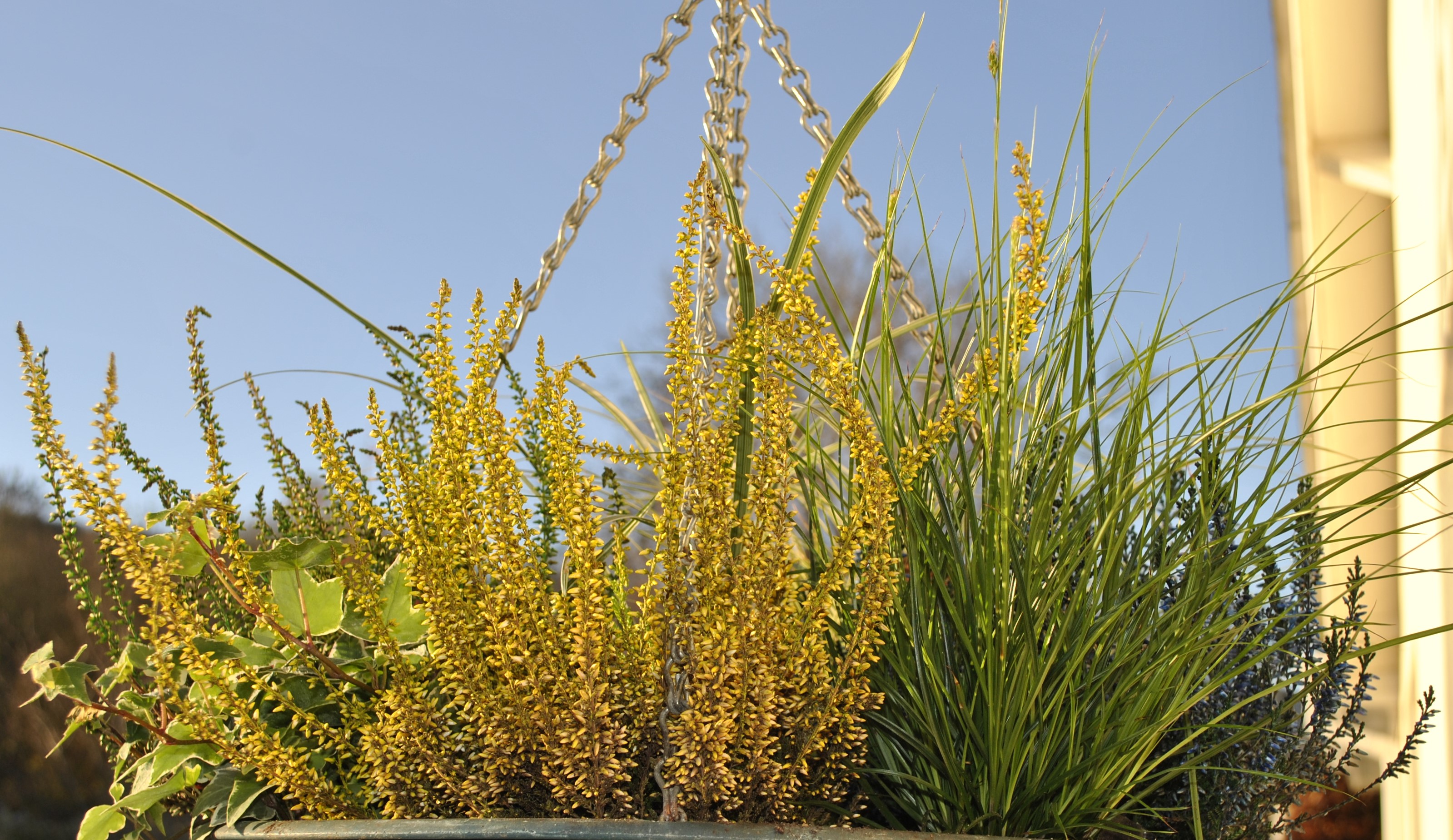I don’t normally go in for sprayed heathers but I wanted some winter basket plants and I was in a hurry! A yellow heather could almost be realistic…..