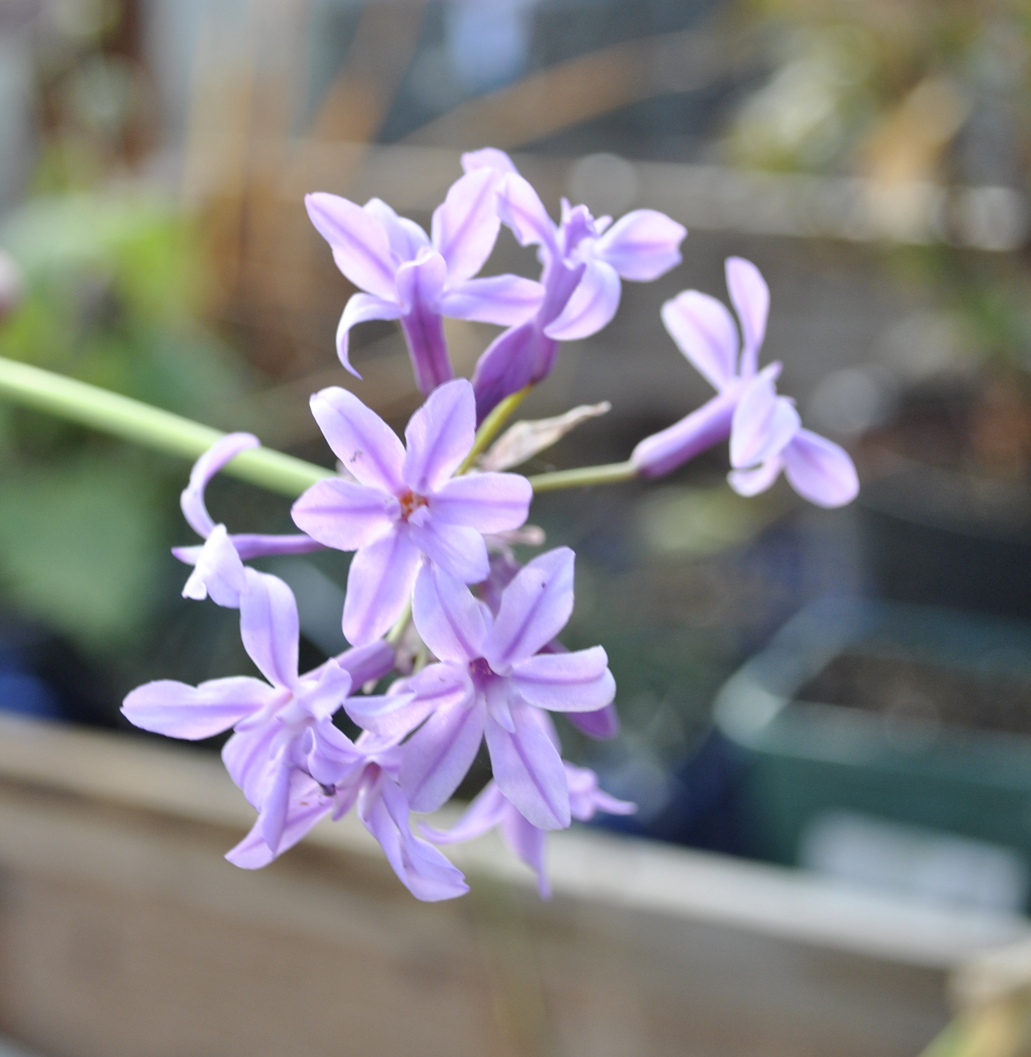 The very last flower of Tulbaghia violacea enjoying the relative warmth of the greenhouse. Unfortunately, the confined space causes the garlicky onion smell to hit me as I open the door!