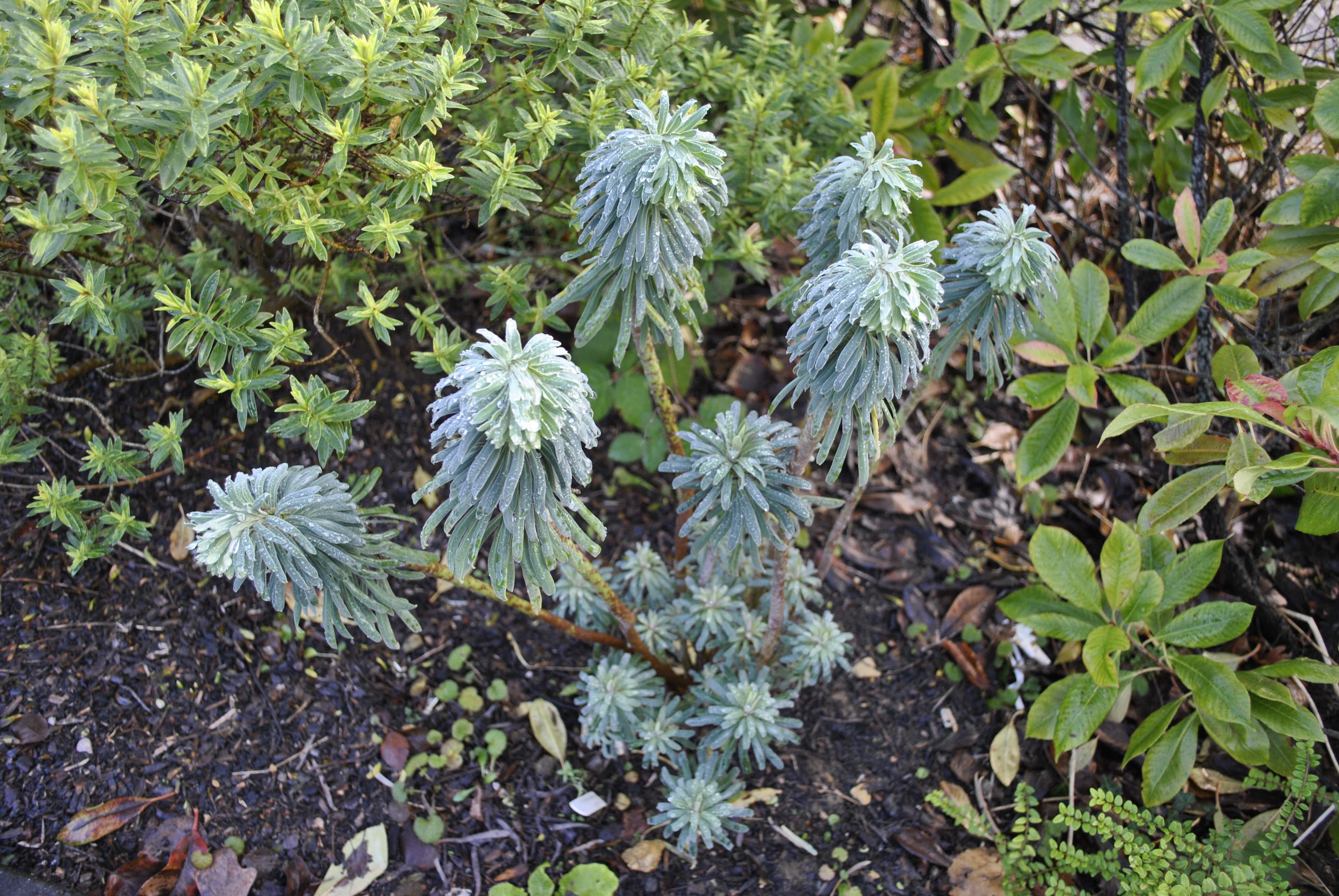 Finally, a rather sorry-looking clump of Euphorbia characias, battered and bruised from wind, rain, frost and snow, is now beginning to lift its head to the skies to welcome the sunshine. Considering its natural home is the dry rocky slopes of the southern Mediterranean it must be fed up with our weather! Like us all, it will recover and in a few weeks won’t remember what all the fuss was about!