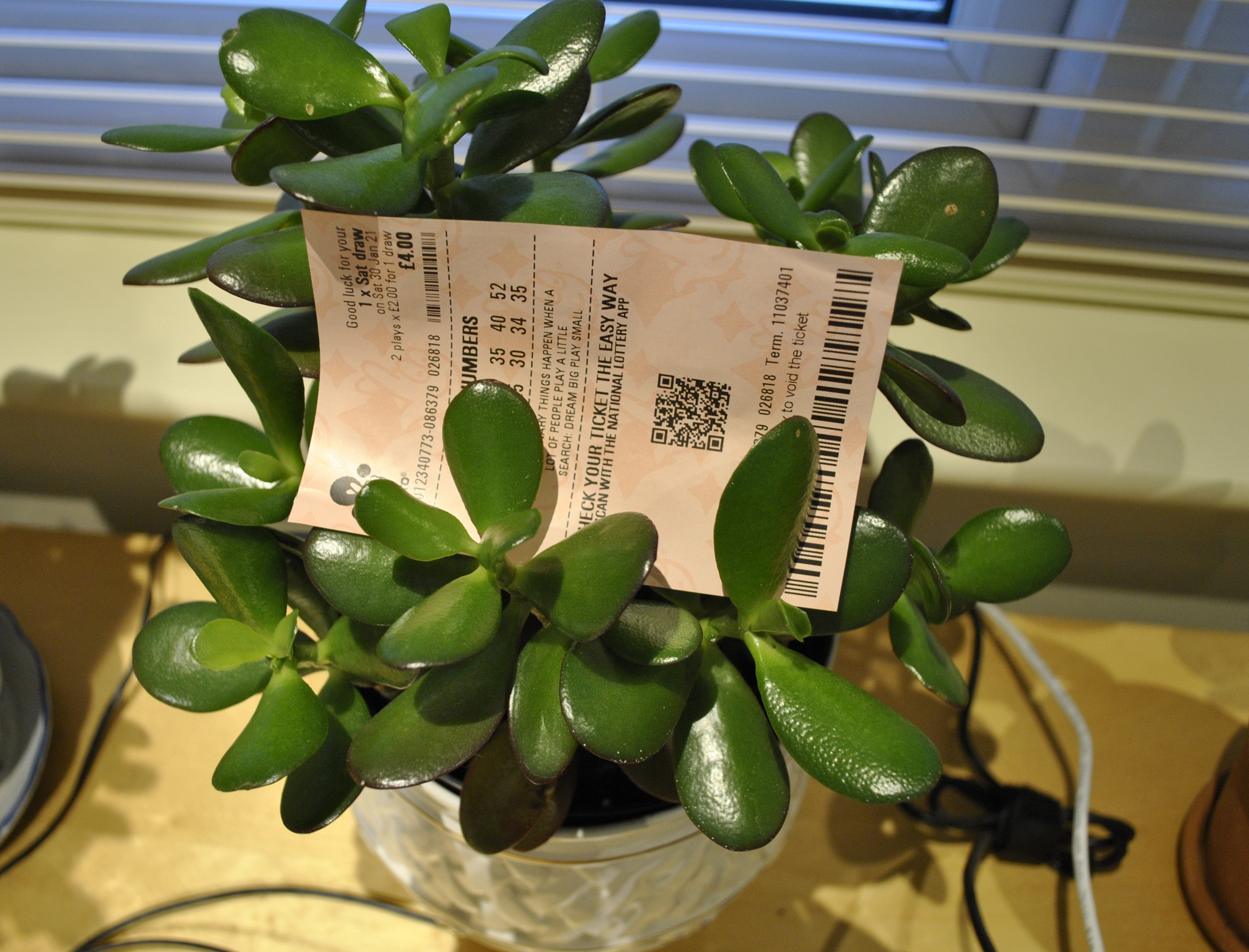 Never mind, I am going to win the Lotto ‘quadruple rollover’ tonight which will magically make everything all right! Lurking behind my desktop computer is a pot of Crassula ovata cuttings, otherwise known as the Jade plant or, as my mother called it, the Money Plant! I am following a family tradition and placing my lottery ticket on the Money Plant which will obviously induce a massive win. I know what you’re thinking and no, my mother never won a thing, not a sausage! Neither have I, well nothing big; the occasional free lucky dip but nothing more. But tonight, of course, is going to be different!