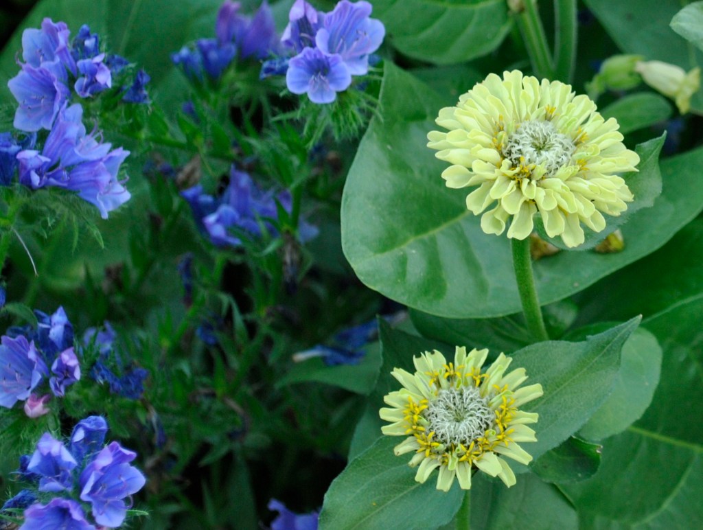 Zinnia ‘Envy’ with Echium vulgare ‘Blue Bedder’, two of the best pollinator plants you can grow from seed to flower in the same year. These are on the list for this year along with