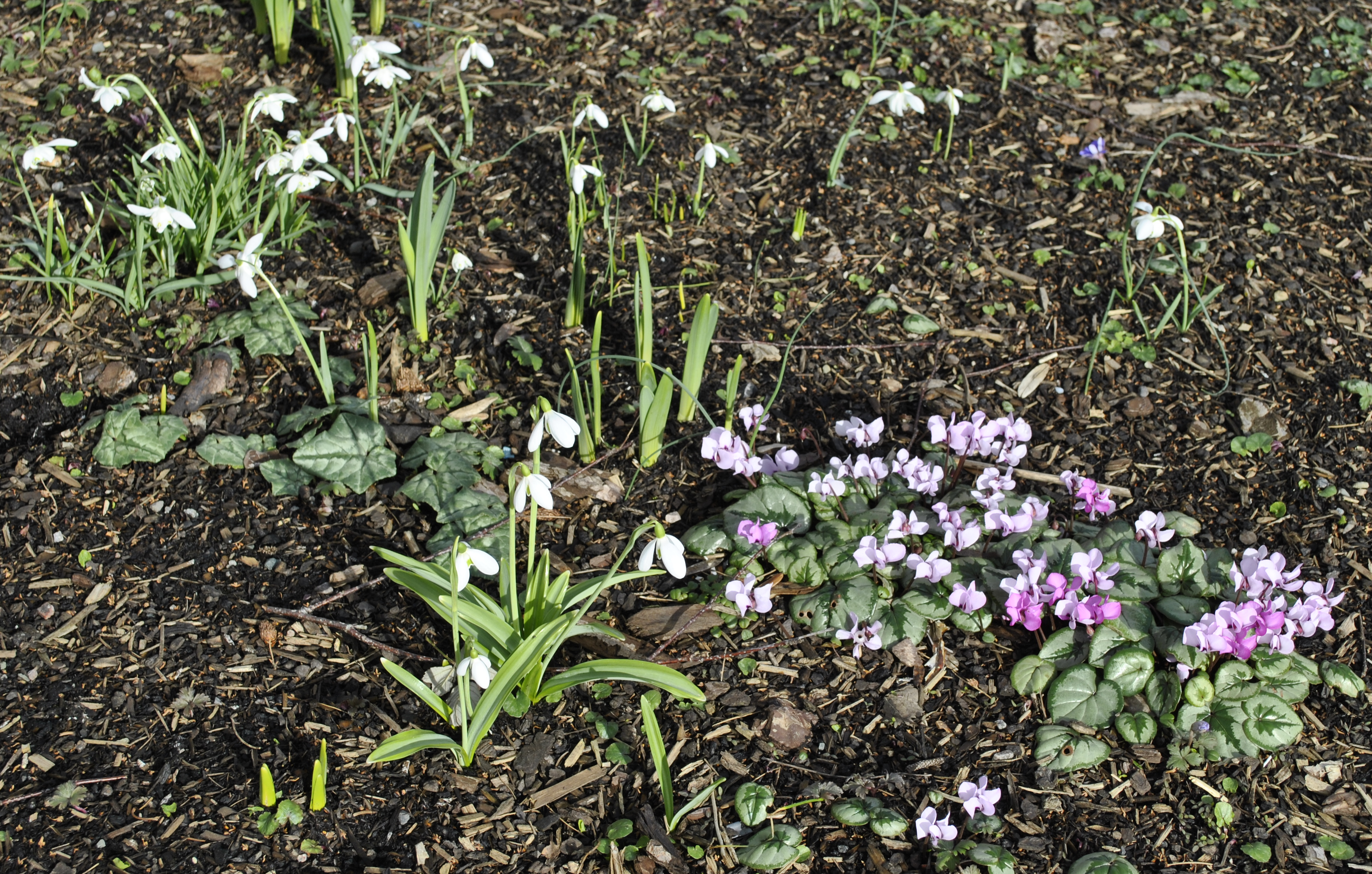 The Snowdrops and Cyclamen are looking happy in the spring sunshine today. Amazing to think they were hidden by snow just two weeks ago. Soon they will be joined by a carpet of Anemone blanda in blues, pinks and white. They are just poking their heads above ground to check their timing.