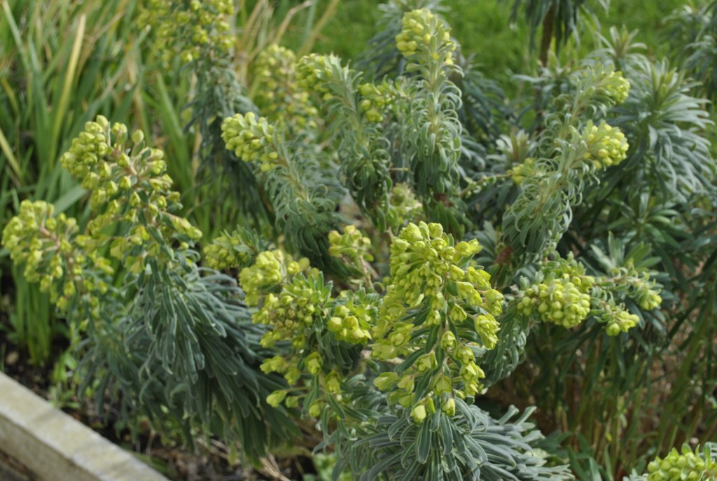 This young self sown Euphorbia characias landed happily in the right spot so was left to grow. It looks like it might be producing some flowers in just it’s second year. I love the acid green bracts and flowers which brighten up dull days and improve my mood.