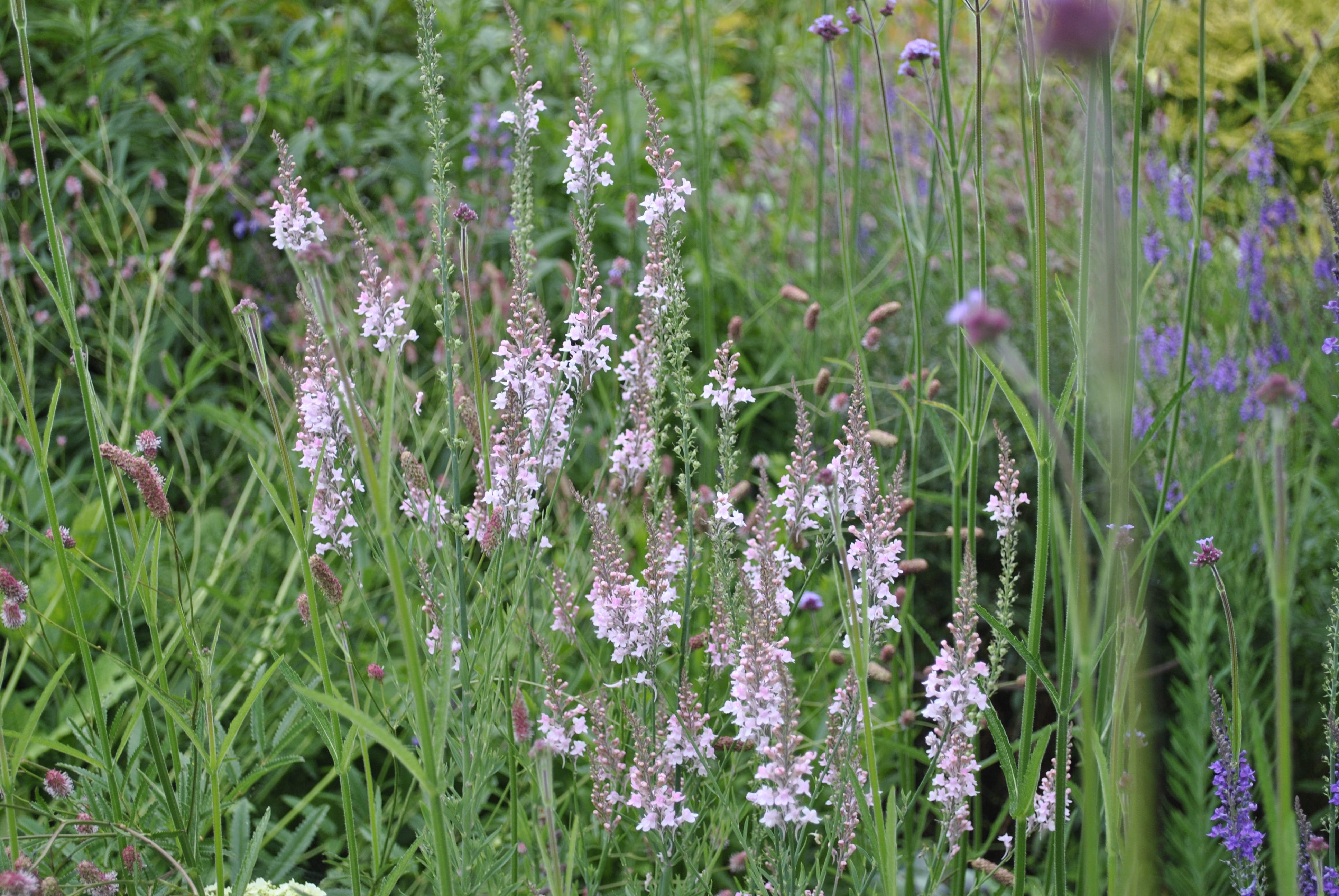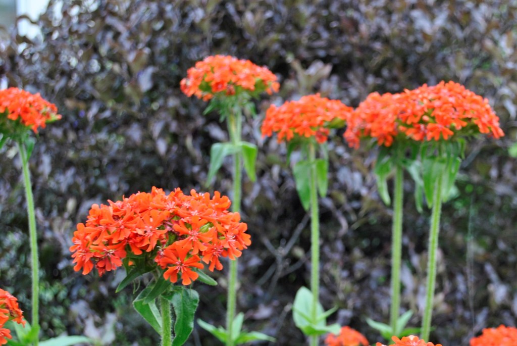 Dianthus carthusianorum, a tall pink with clusters of gorgeous dark red buds which break out into pale pink flowers over a long period in June and July. I spotted this in the long borders at Hidcote and bought three in the plant shop. One has since died but the other two are romping away and clumping up well with more flower stems each year. Thriving on neglect, they love my dry alkaline clay in summer, not too keen on my wet clay in winter!