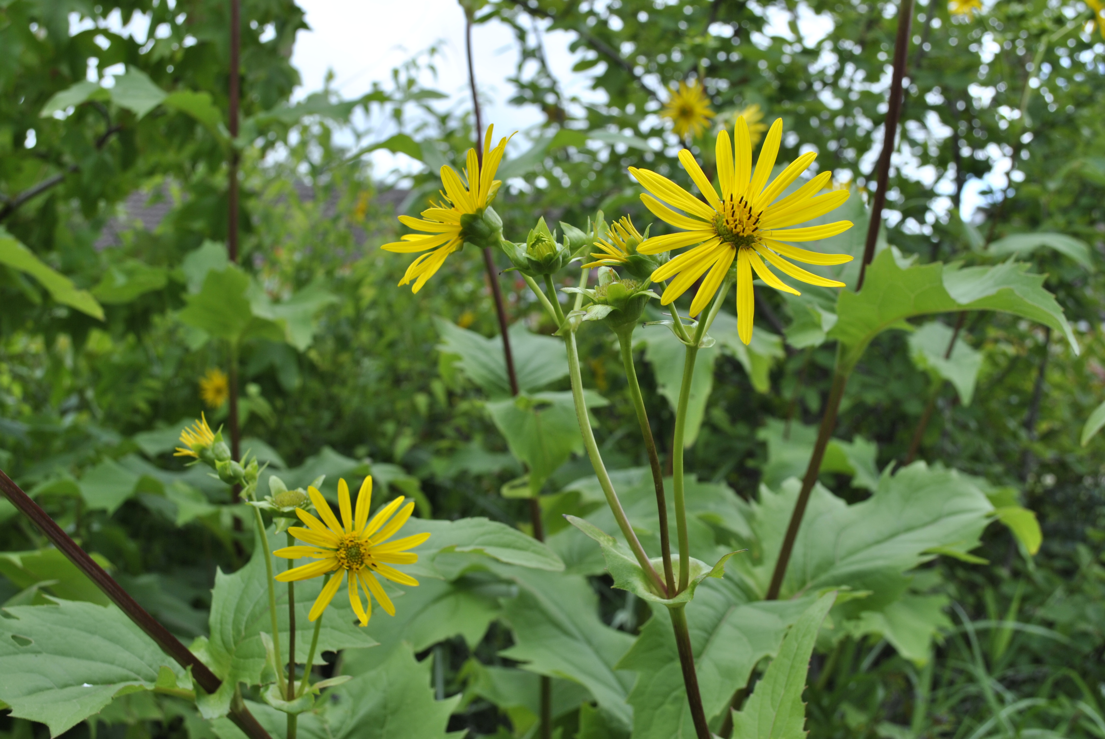 The Rudbeckia laciniata was divided and replanted earlier in the year which may explain why it is not quite so tall this summer, although it may have been the very dry June, it did flop quite a bit! Normally around 7 feet tall, it is barely 5 feet this year. Still one of my favourites though and seeds itself around a lot so I always have loads of young plantlets to share.