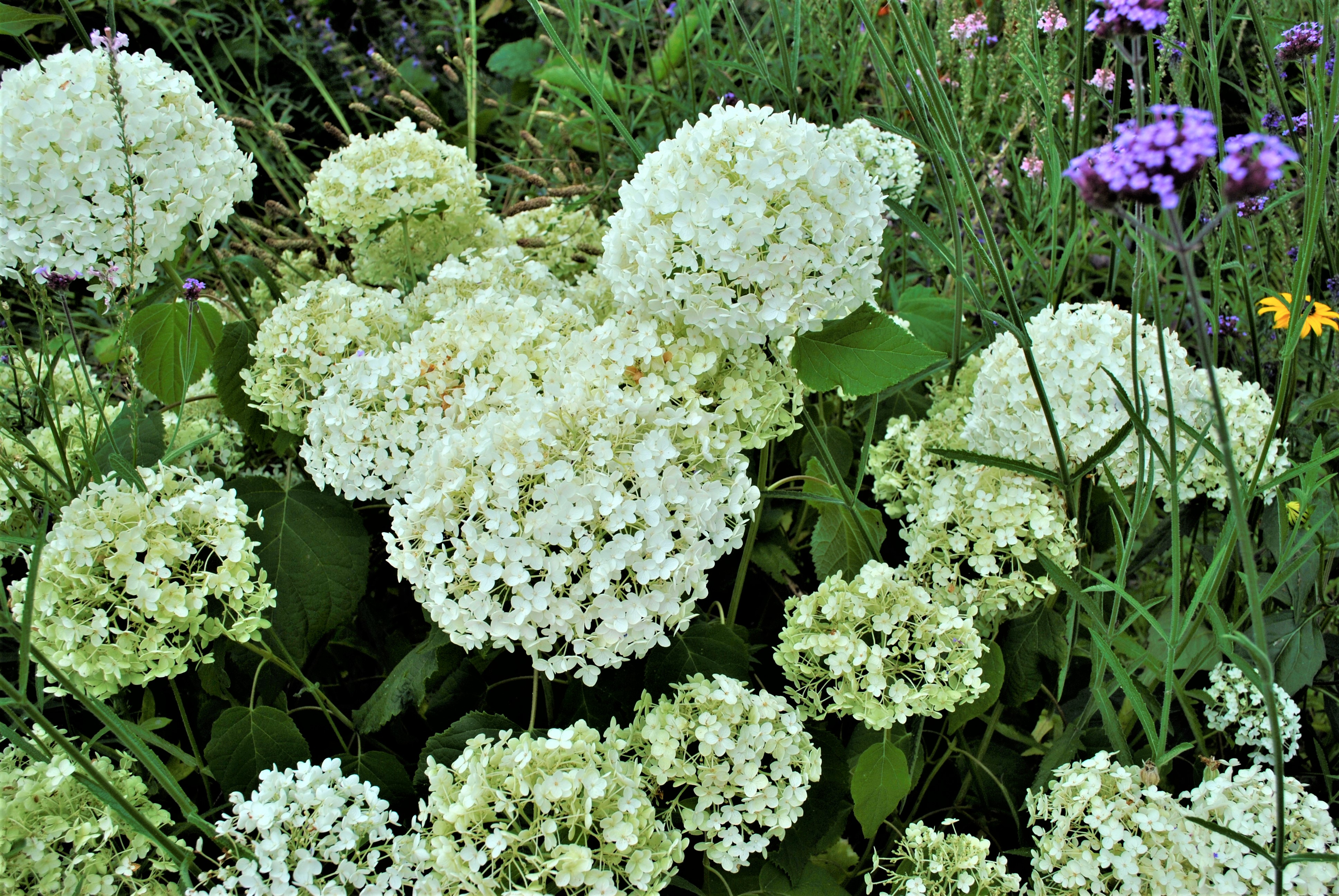 Hydrangea arborescens ‘Annabelle’ is a bit hit & miss in my garden. Some years it’s great, some years not so great. It is very dependent on the extent of spring rainfall. However, I learned something interesting last year from a professional gardener at a country house who said she was unhappy with the way the huge floppy flowerheads drooped, particularly after rain. So, she experimented with the pruning and discovered that if you don’t prune them so hard, the flowerheads are smaller but they stand upright on stronger stems. So, that’s what I did and it works! The flowers will still be impressive and should remain upright.